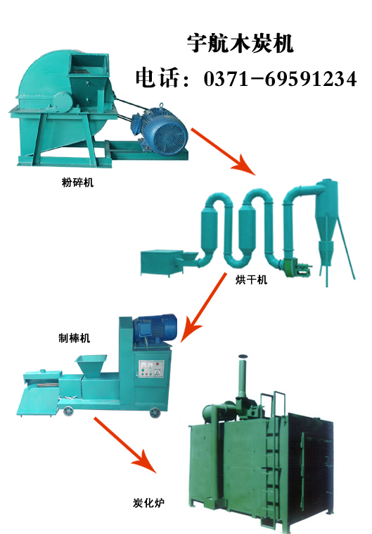 新型機(jī)制木炭機(jī)設(shè)備將樹枝、秸稈、稻草、花生殼、樹干、 棉花秸稈、 茶籽殼、果殼、 雜草、樹葉等含有可以生產(chǎn) 木炭的生物質(zhì)纖維的原料填入,經(jīng)粉碎機(jī)粉碎成10mm之內(nèi)的粉末,經(jīng)烘干機(jī)烘干使之含水份含量在12%以內(nèi),入制棒機(jī) 經(jīng)高溫,高壓使之成型(不加任何添加劑)后放入炭化爐進(jìn)行炭化,即成成品機(jī)制木炭。也可以將物料粉末直接使用連 續(xù)式炭化爐高溫炭化成炭粉。